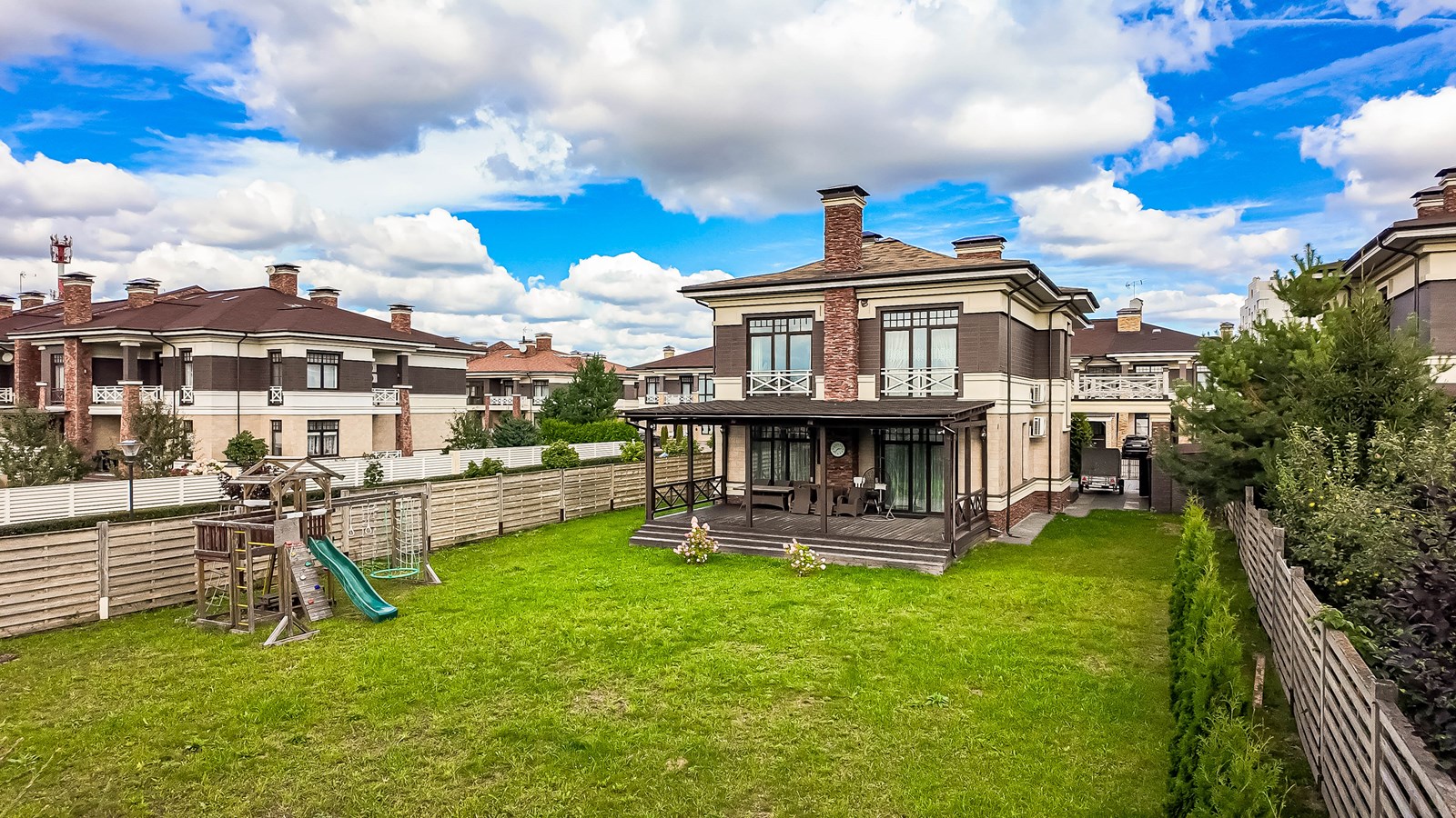 ЛОТ 1270825 Продается элегантный дом в классическом стиле в закрытом коттеджном поселке «Прозорово». Просторный и светлый, полностью готов к проживанию. В доме предусмотрены теплые полы, встроенная система кондиционирования и видеонаблюдение по периметру. Участок благоустроен: есть хозяйственная постройка, детская площадка и парковка на 2 автомобиля. Поэтажное описание: 1 этаж – прихожая, зал с обеденной зоной и выходом в сад, кухня, кабинет, гостевой санузел. 2 этаж – три спальни с гардеробными, два санузла, лоджия и балкон.